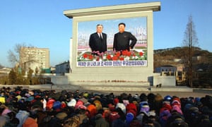 North Koreans bow in front of portraits of Kim Il-sung, left, and Kim Jong-il in Pyongyang. Photograph: Kcna/Reuters