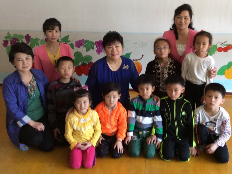 Sue with staff members and children at the School for Mentally Impaired Children in Pyongyang