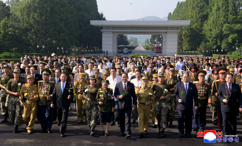 2025년 7월27일 박태성 북한 내각총리를 비롯한 당과 정부, 최고인민회의 상임위원회 간부 등이 정전협정 체결 72주년을 기념하는 참배를 위해 평양 형제산 구역에 자리한 신미리애국열사릉으로 들어서고 있다. 조선중앙통신 연합뉴스