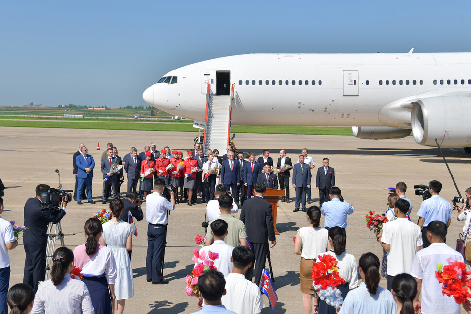 2025년 7월29일 북한 평양국제비행장 활주로에서 평양-모스크바 직항 여객기 운항 재개 축하행사가 열리고 있다. 연합뉴스
