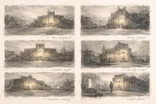 Early thumbnail studies testing how one city might hold two sacred histories at once, with space, geometry, and imbalance doing the work before detail arrives.