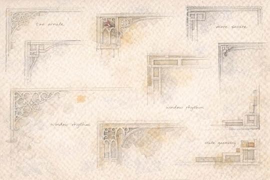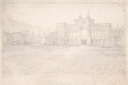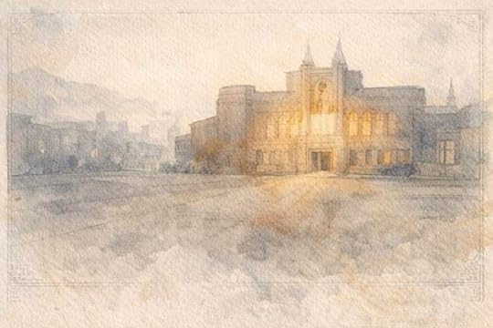 At the first-wash stage, the image begins to breathe, as cold civic light and fugitive sacred warmth separate into the mood the finished painting will carry.