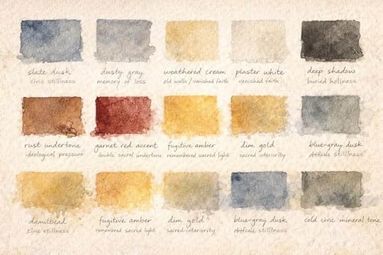 These palette trials map the tension between mineral state severity and the softer afterglow of erased faith, translating the book’s cover logic into watercolor weather.